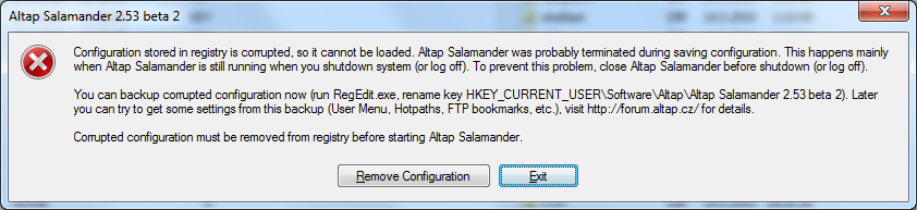 Configuration stored in registry is corrupted, so it cannot be loaded. Altap Salamander was probably terminated during saving configuration. This happens mainly when Altap Salamander is still running when you shutdown system (or log off). To prevent this problem, close Altap Salamander before shutdown (or log off).