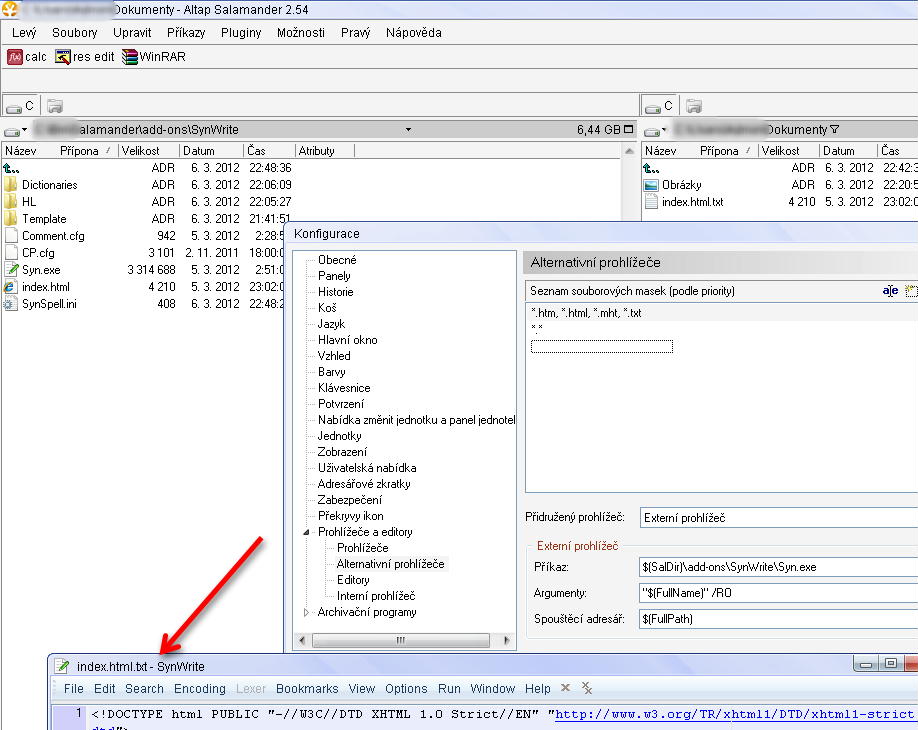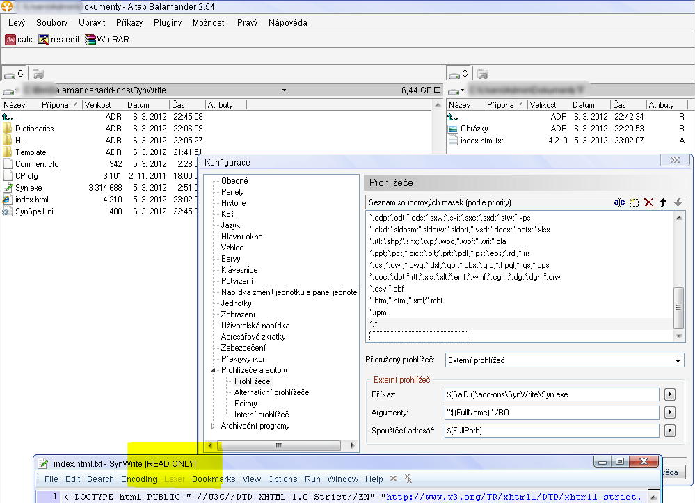 snažil som sa nastaviť si SynWrite - http://www.totalcmd.net/plugring/syn2.html ako prehliadač (t.j. som na subor.txt - a stlačím F3) aj ako alternativny (t.j. som na subor.txt - a stlačím Alt+F3) externy prehliadač pre niektoré typy súborov - TXT, HTM, HTML a MHT.